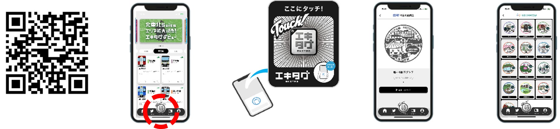 ①アプリをダウン ②「タッチする」 ③「エキタグ」に ④「デジタル駅 ⑤スタンプ帳に