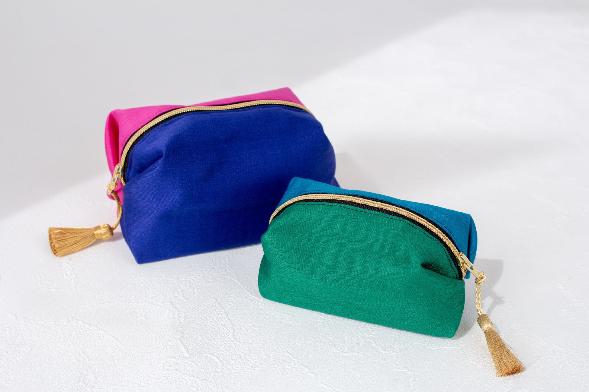 製造工程で時々でてしまう、生地にほんの小さなキズや汚れがついたハンカチーフがあります。従来ならば破棄されるはずだったそれらに再び息を吹き込み、新たに誕生したのがre-editの商品です。ハンカチーフを一枚一枚確認し、使用できる部分をリメイクして作られたre-editのポーチ。ハンカチを3枚使って風船型のポーチを作りました。使わない時は平たくたためてコンパクトに。