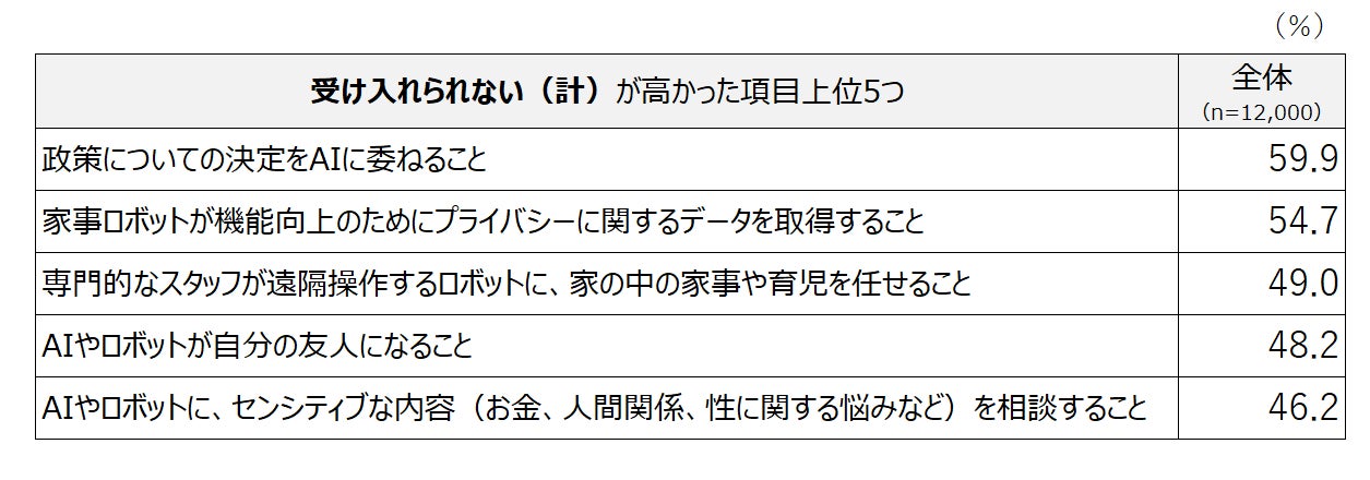 逆に「受け入れられない(計)」が高かったものは、政策決定をAIに委ねることや、プライバシーに関わるものが挙げられている。「AIやロボットに、センシティブな内容(お金、人間関係、性に関する悩みなど)を相談すること」を46.2%が「受け入れられない(計)」と回答しているが、年代別に見ると18-29歳では「受け入れられない(計)」は35.4%にとどまる一方、50.9%が「受け入れられる(計)」と回答するといった特徴が見られた。