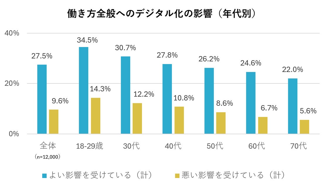 1.デジタル化が進んでも働き方全般の変わらない人は約半数、デジタル化でよい影響を受けている人の方が悪い影響を受けている人よりも多い