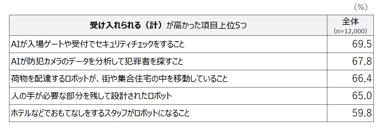 私たちの日常生活では既にAIやロボットが活用される場面が多く見られ、今後さらにこうした場面が増えていくと仮定してそれらの受容度を尋ねた。「受け入れられる(計)」が高かったものは、入場時のセキュリティチェックや防犯カメラでのデータ活用による犯罪者の捜索、荷物配達ロボットなどであった。また、人の手が必要な部分を残して設計されたロボットへの受容度も高かった。
