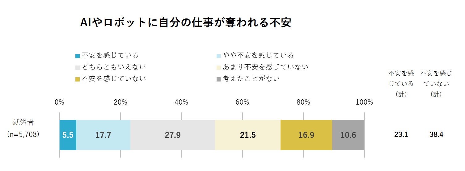 AIやロボットなどのデジタル化が進むことによって、自分の仕事を奪われる不安を感じているかについて、現在働いている人(就労者 n=5,708)を対象に尋ねた。その結果、「不安を感じている(計)」23.1%、「どちらともいえない」27.9%、「不安を感じていない(計)」38.4%、「考えたことがない」10.6%と、回答がやや分散した。