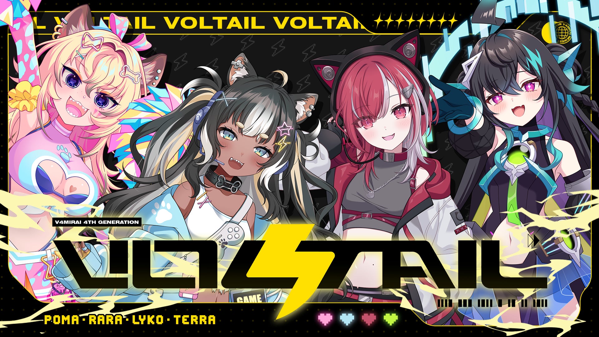 「Poma Pon」「Lyko Lianna」「Rara Rocora」「Terra 404」の4名が、新ユニット「Voltail(読み:ゔぉるている)」およびV4Mirai第4期生として活動をスタートいたします。V4Mirai第4期生ユニット「Voltail」は"ゲーマー"が集まったユニットです。Voltailのメンバーそれぞれが得意とするゲームを持っており、さまざまなゲーム配信を通じてみなさんと会えることを楽しみにしています。稲妻のモチーフは電気の「ボルト」に由来し、ハードコアゲームの激しさや彼女たちのゲームへの情熱、そしてゲームに打ち込むクールさを通じた対照的な二面性を表現しています。様々なジャンルのゲームに打ち込む彼女たちが、今までのV4Miraiになかった新しい展開を呼び込んでまいります。是非ご注目ください!