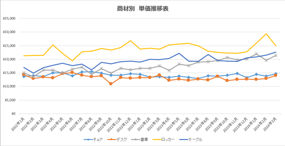 〇 デスク :↑ 販売価格 1,128円増加(昨月)/ -153円減少(昨年)・・・