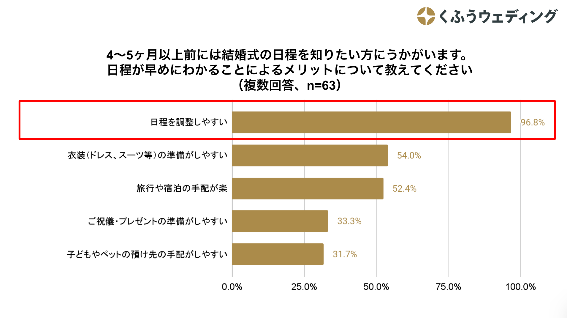 結婚式に参加した経験がある人に、招待される結婚式の日程はどのくらい前に知りたいかを聞いたところ、6割以上が4〜5ヶ月以上前には知りたいと考えていることがわかりました。中には「6ヶ月前またはそれ以上」と回答した人も15.7%いました。日程が早めにわかることによるメリットについて聞いたところ、「日程を調整しやすい」96.8%、「衣装(ドレス、スーツ等)の準備がしやすい」54.0%、「旅行や宿泊の手配が楽」52.4%などが挙げられました。結婚式に参加するゲストにとって、日程を早めに知ることは、仕事や家庭のスケジュール調整がしやすくなり、衣装の準備や旅行・宿泊の手配を余裕を持って行えるメリットがあることがわかりました。