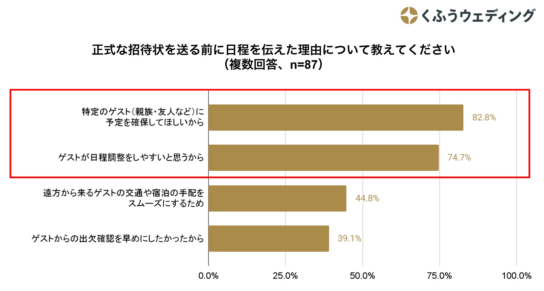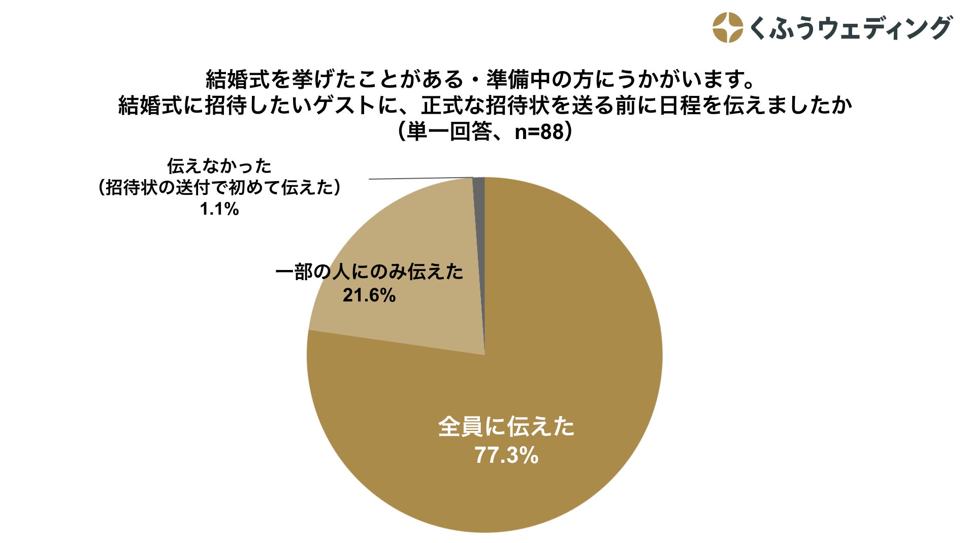 1. 結婚式の開催経験がある、または準備中の花嫁・花婿の約99%が、正式な招待状を送る前にゲストに日程を伝えたと回答、理由は「特定のゲストに予定を確保して欲しいから」「ゲストが日程調整をしやすいと思うから」