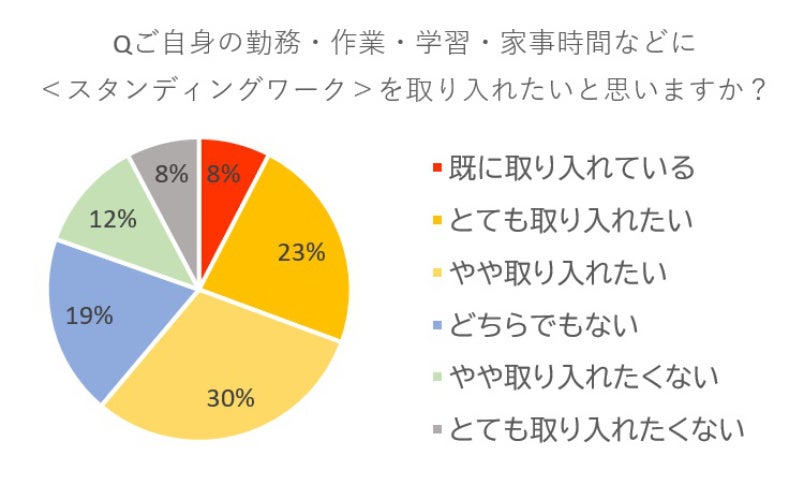 当社では、2021年に自宅向け電動昇降デスク「STANDSIT(スタンジット)」を発売。市場としても拡大傾向にあり、今後さらに昇降デスクが浸透していくことが考えられます。しかし、当社が2022年4月に行ったアンケート調査では、「スタンディングワークを取り入れたい」と回答する方が53%いる一方で、実際に「既に取り入れている」と回答した方は8%に留まりました。(※2)
