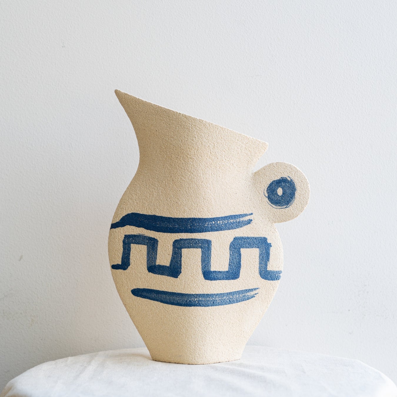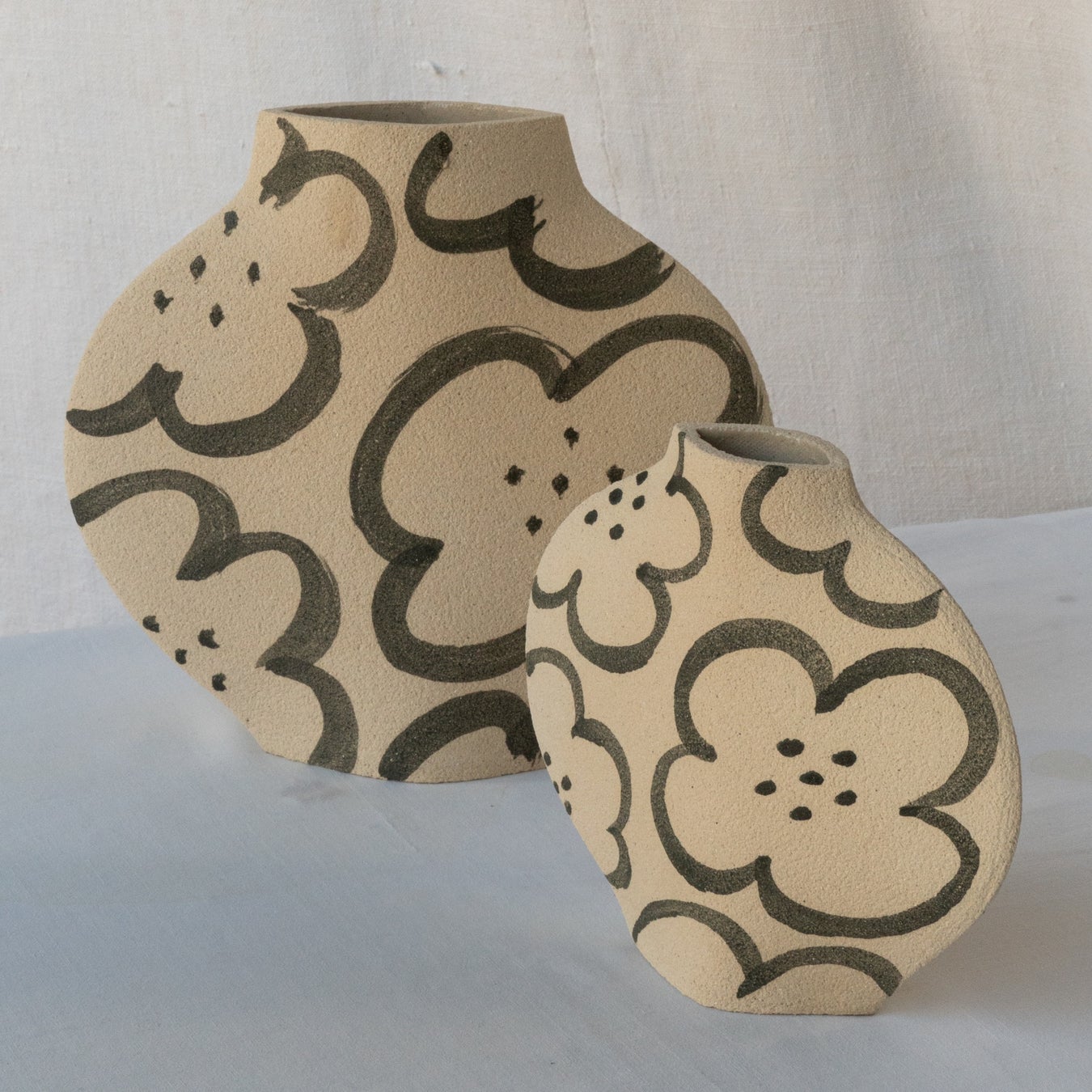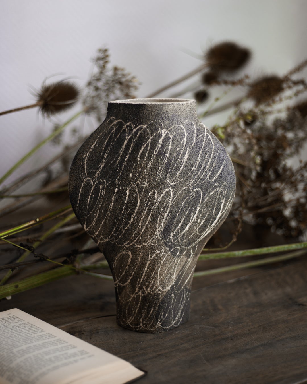 彼女の花瓶は、内面のみに釉薬がかけられ表面はざらざらとした土の質感を残しており、そこに自由な筆使いで絵が描かれています。それは「絵画としての花瓶」という無邪気な楽しさと、私は手仕事を捧げて自然を補完するのだ、という謙虚な決意の同居であり、作品に他にはない優しさと規律を与えています。