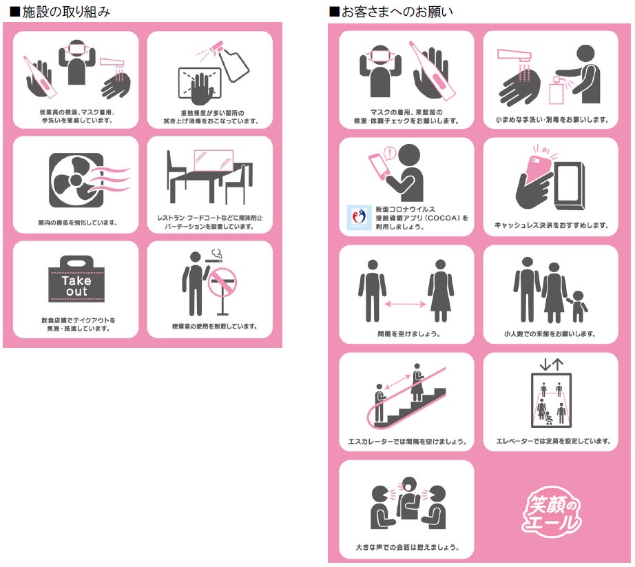 三井不動産グループが運営する商業施設では、新型コロナウイルス感染拡大防止のため、下記をはじめとした様々な取り組みを実施しております。