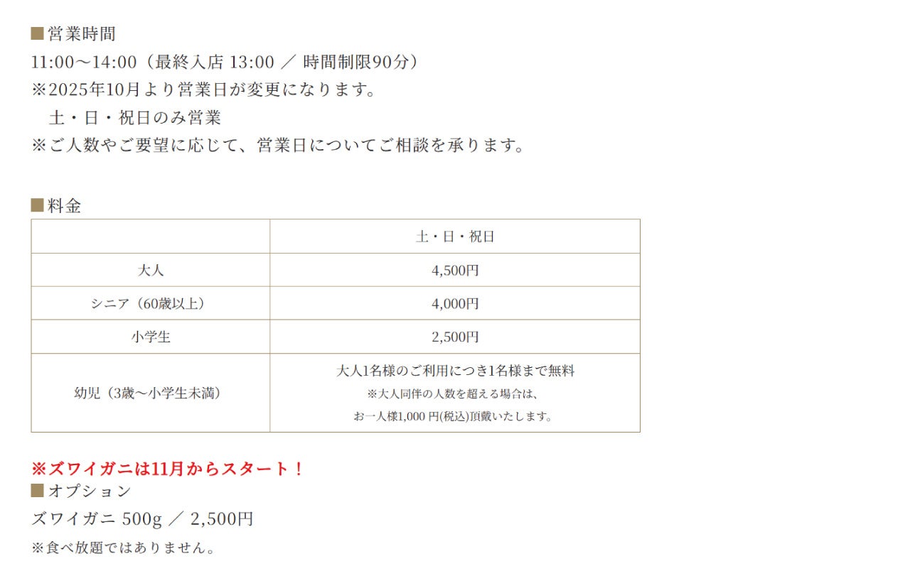 ズワイガニ食べ放題、ドリンク、追加オーダー、小学生以下のお客様は対象外です。