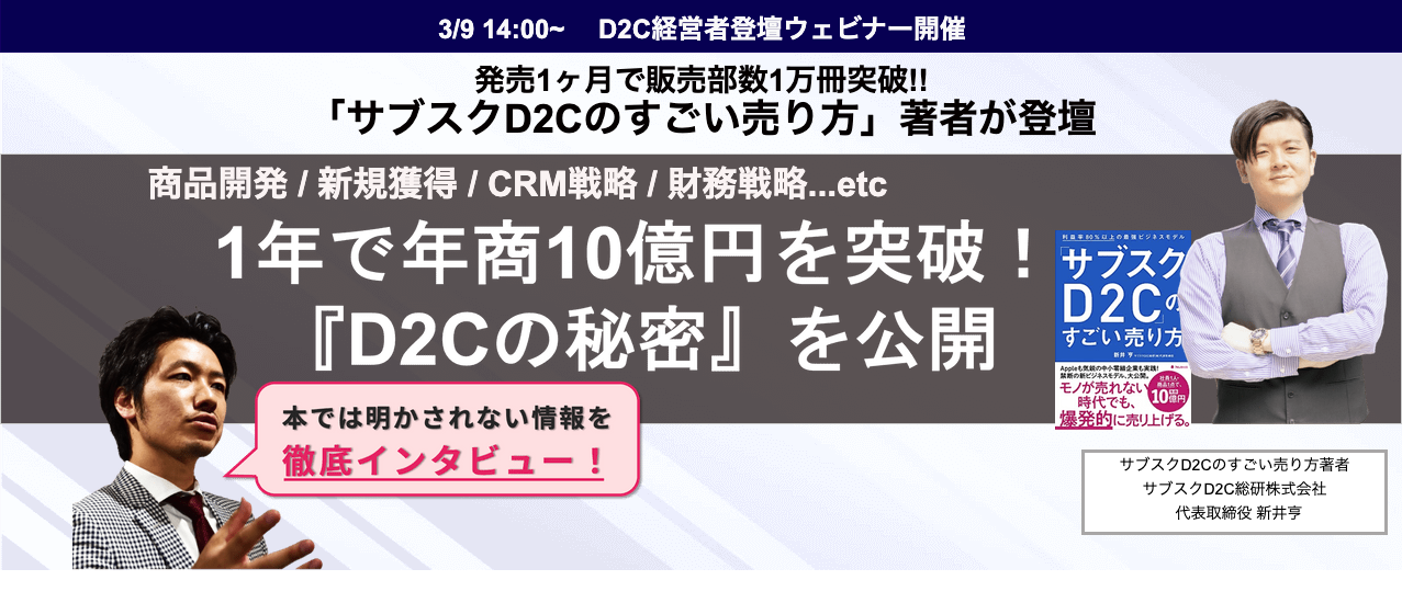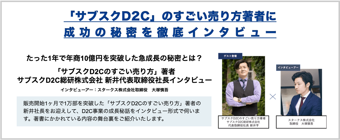 今回のウェビナーではそんなD2C事業のプロフェショナルである新井亨が登壇し、出版した「サブスクD2Cの凄い売り方」の本書では伝えきれなかった裏側の部分までをインタビュアーのスタークス株式会社取締役 大塚慎吾氏を通してお伝えする企画となっています。