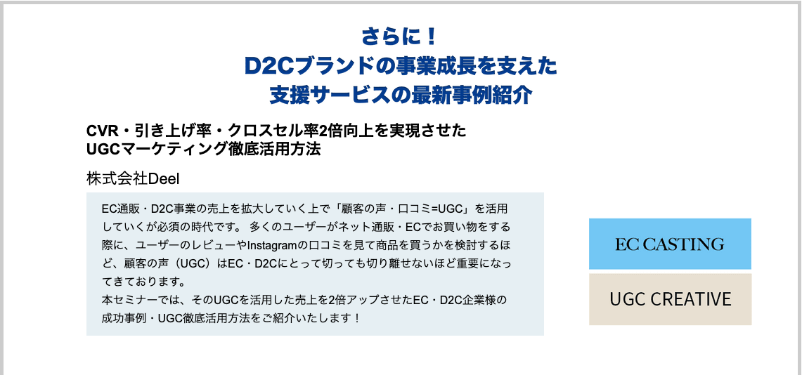 さらに、今回のウェビナーでは事業成長をさせたInsatgram・LINEの最新活用事例についても、実際にD2Cビジネスで利用しているサービスの最新施策事例やトピックと合わせて共有いたします