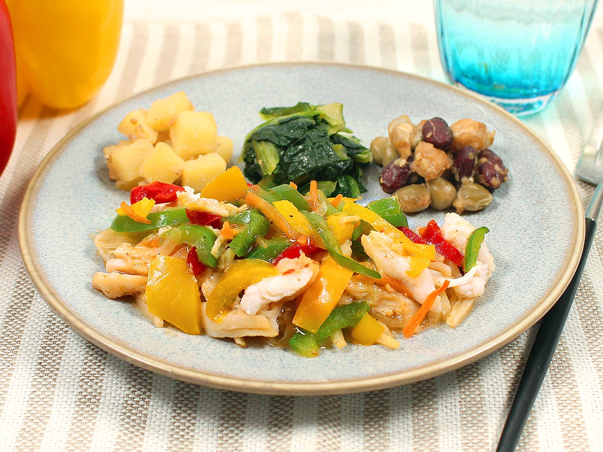 蒸し鶏ささみのうえに、鮮やかな三色ピーマンと人参をトッピングしました。唐辛子の辛味と花椒の痺れが絶妙に調和したソースで仕上げています。