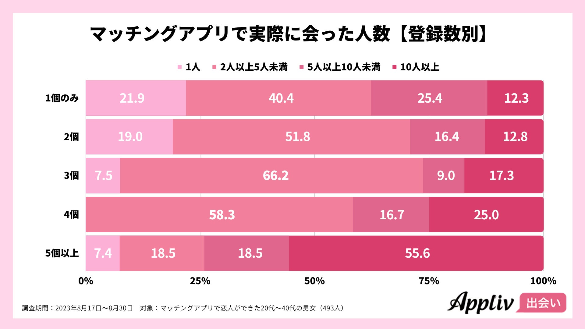 マッチングアプリを通じて実際に会ったことがある人数を調べたところ、「10人以上」と回答した割合は登録したアプリの数に比例して多い結果となりました。