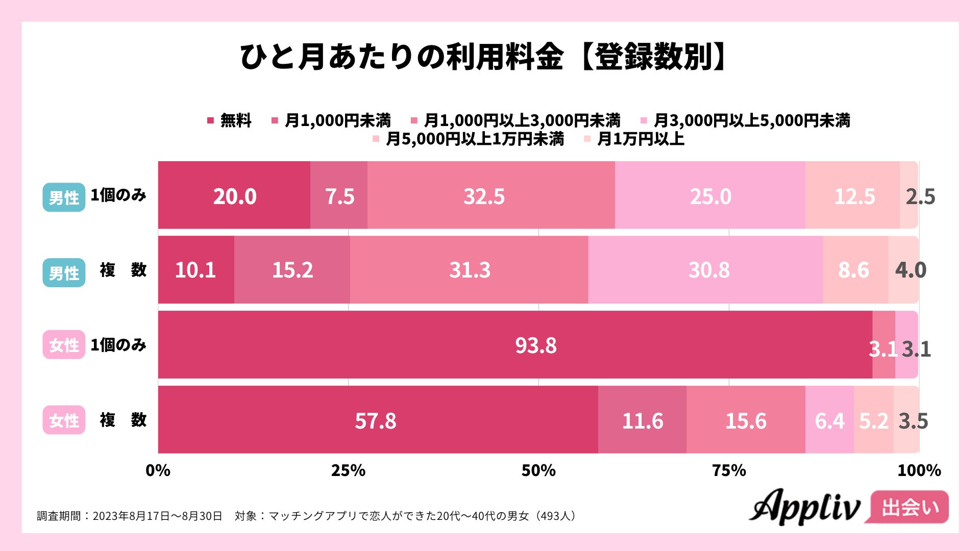 一方で女性の内訳を見てみると、1個のみ登録した人の9割が無料で利用しているのに対し、複数のアプリに登録した女性は約4割が月1,000円以上かけている結果でした。女性の場合、ほとんどのマッチングアプリを無料で利用できますが、複数利用している人の方がお金をかけているようです。