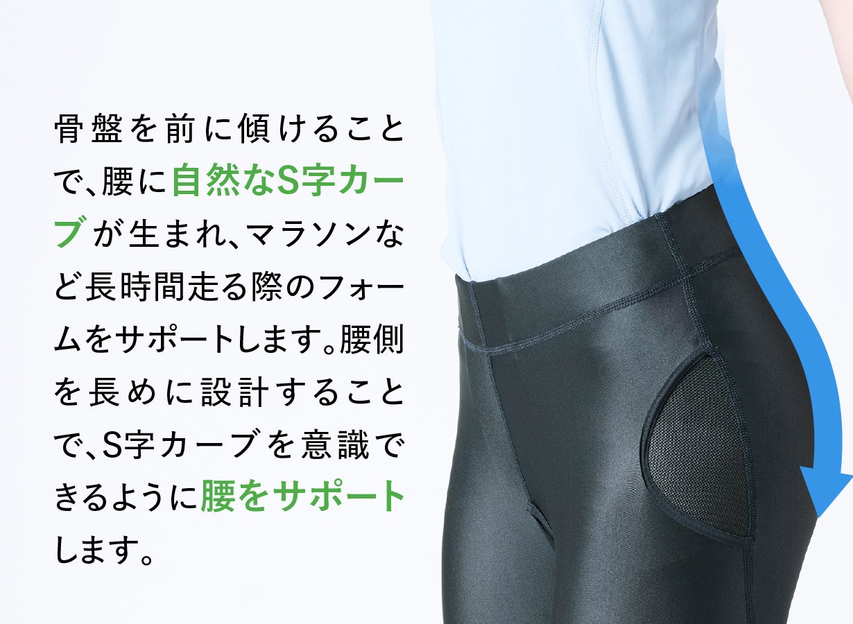 ウエスト部分の幅広ゴムベルトが腰を支え、姿勢崩れにアプローチします。骨盤を前に傾けることで、腰に自然なS字カーブが生まれ、マラソンなど長時間走る際のフォームをサポートします。また、腰側を長めに設計したことで、S字カーブを意識しやすくなっています。