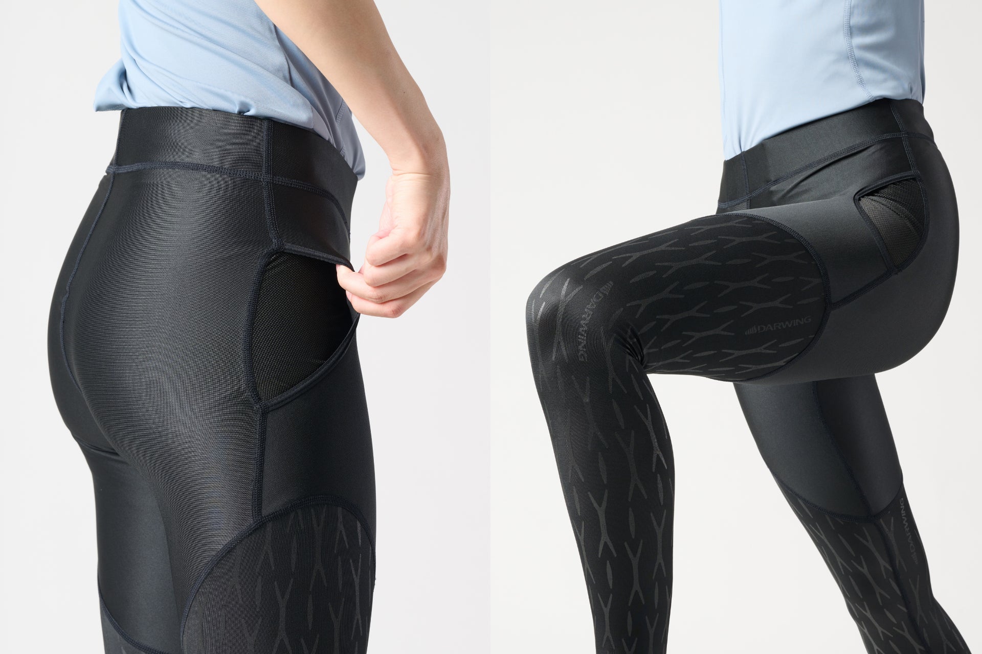 ランナーをサポートし、パフォーマンスを維持してマラソンを走り切るランニングタイツとして2019年に開発された「DARWING ランニングモデル」が進化し、2024年12月に新モデル「DARWING アスリート ロングタイプ」が誕生しました。太ももから足首にかけてプリントされたサポートラインでひざを安定させ、ふくらはぎの程よい圧迫により筋肉のブレを低減させることで、脚全体のサポートを実現しています。当社のサポーター技術を応用したダブルレイヤ―(2層)構造で、脚を引き上げ、次の一歩を軽々と振り出せます。トップアスリートから趣味を楽しむ方、部活で活躍する方まで、スポーツを楽しむ皆さまをサポートします。