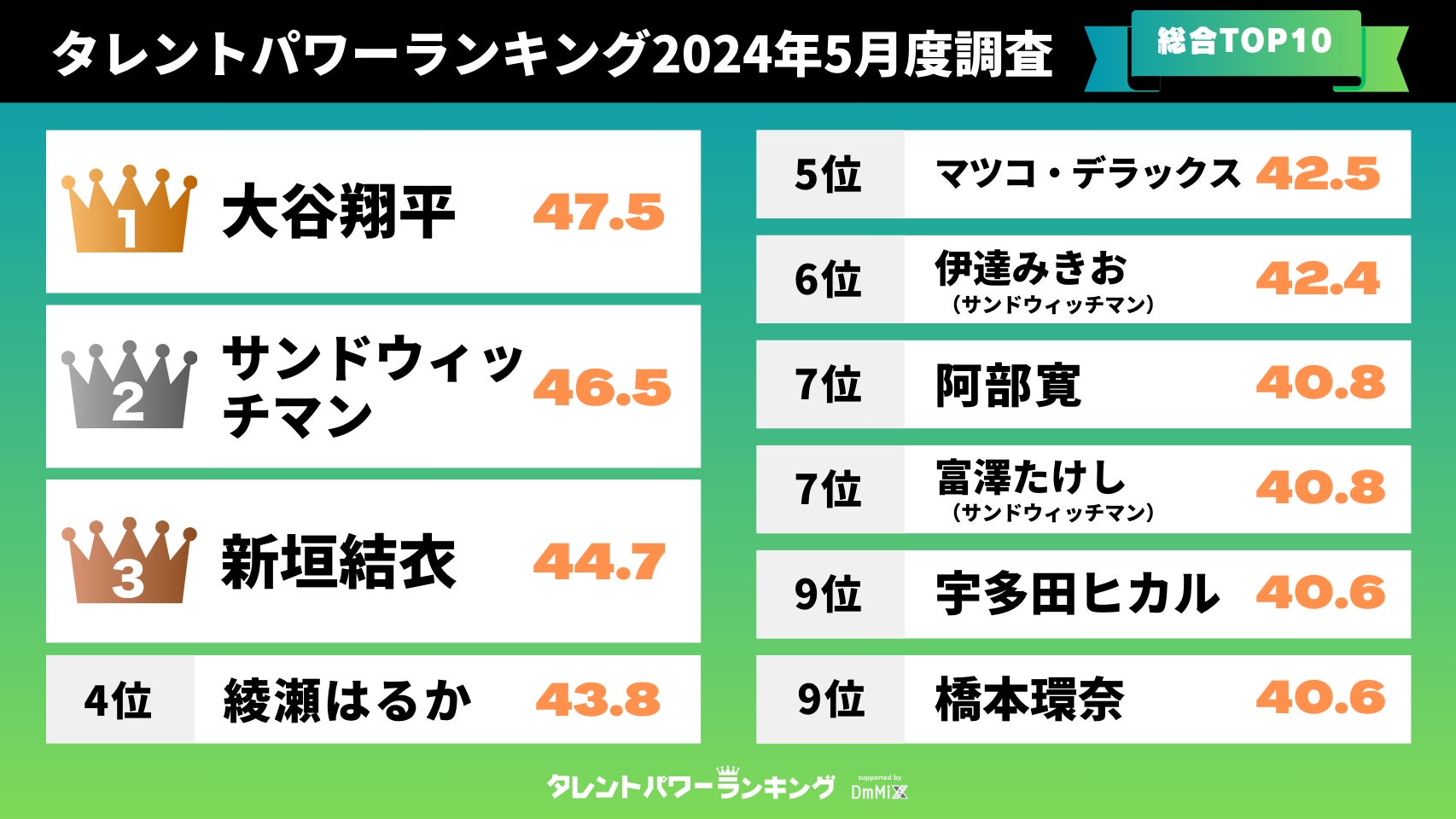 「タレントパワーランキング」2024年5月度調査(第2四半期)の総合トップ10を発表!