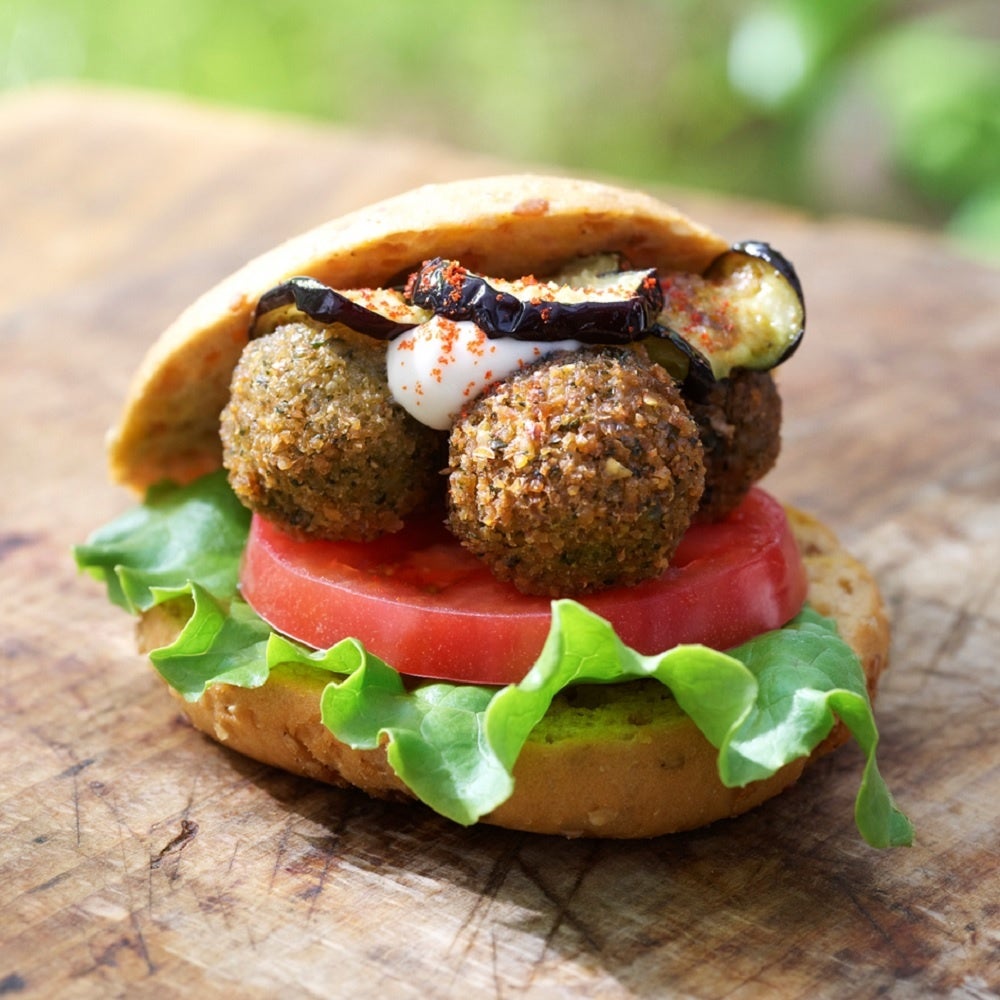 「ZENBブレッド 3種の雑穀」に、ひよこ豆のファラフェル、野菜、自家製マヨネーズをプラス。豆や野菜だけとは思えない満足感を味わえる、プラントベースバーガーです。