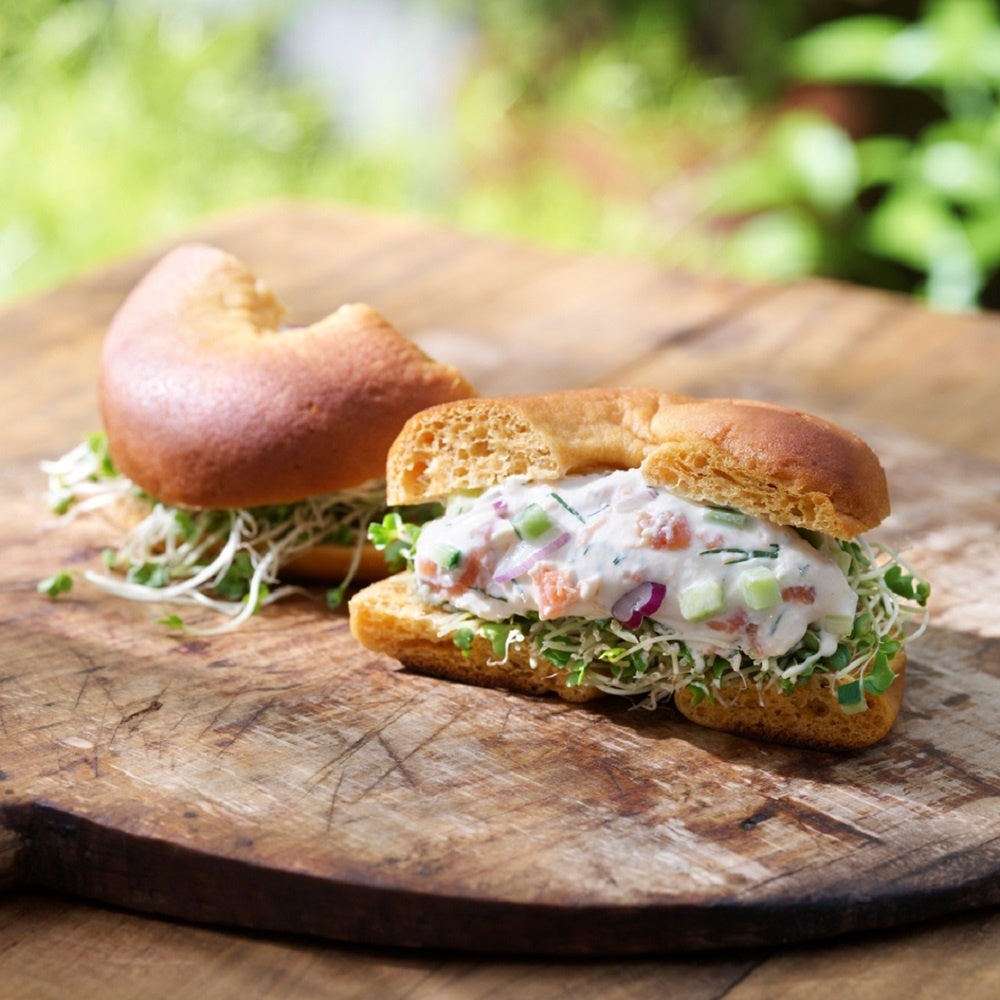 「ZENBブレッド ソフトベーグル」の柔らかい食感に、サーモンとの相性が良い仲間たちを集めたクリームチーズのディップが◎!野菜たっぷりのベーグルサンドは、おいしさとヘルシーのいいとこどりです。