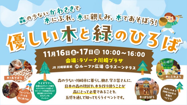 川崎市「優しい木と緑のひろば」は、森の少ない川崎市が市民に対し国が進める国産木材の利用意義について理解を深めるとともに、木への興味を促し、国産木材を利用する機運を高めることを目的に川崎駅前にて開催するイベントです。