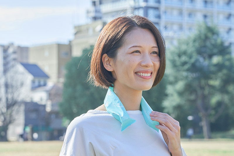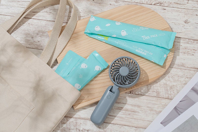 首に巻くタイプの冷却剤のため、両手が塞がらずほかの涼感アイテムとの併用も可能。ハンディファンと合わせると、屋外での活動がより快適に。
