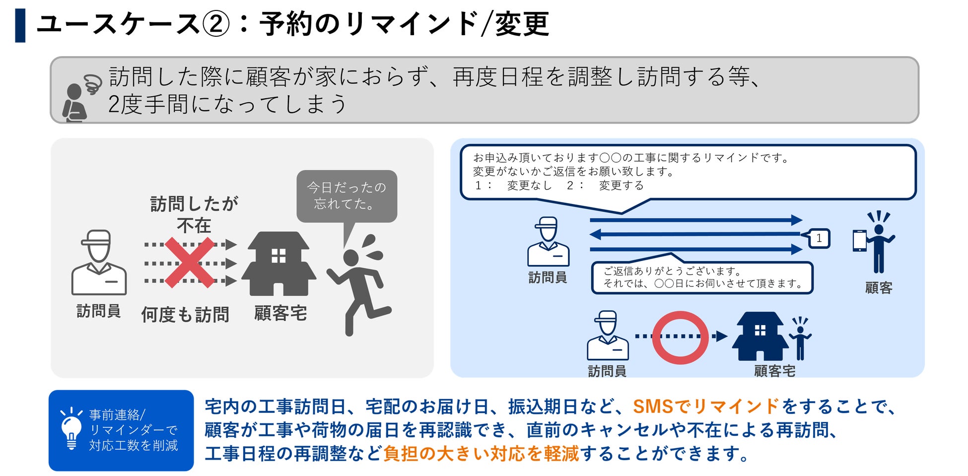 エンドユーザにとって気づきやすいSMS配信にそのまま返信することができるため、簡単な応答を確認したい際に電話での対応やWebサイトへの誘導をさせることなく、双方向コミュニケーションが可能です。これにより、企業側、エンドユーザ側双方の負担を減らし、業務のDXに貢献します。