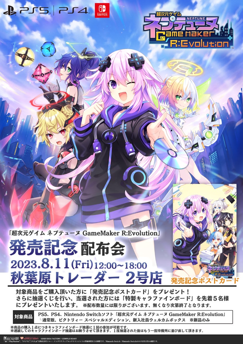 また、2023年8月11日(金・祝)に『超次元ゲイム ネプテューヌ GameMaker R:Evolution』発売記念配布会を開催します。本作をご購入いただいた方に「発売記念ポストカード」をプレゼント。さらに会場にて抽選くじを引いて頂き、当選した方には「特製キャラファインボード」を先着5名様にプレゼントいたします。