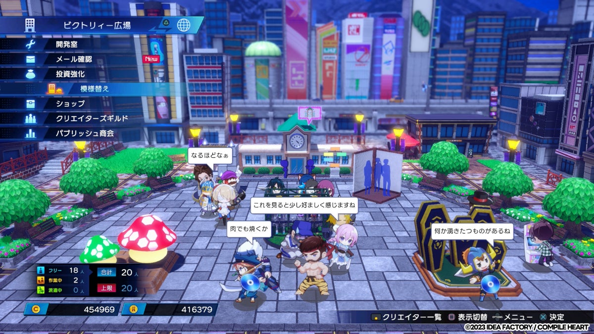 本作では新たなシステムとして「経営パート」が追加。クリエイターを雇い、ディスク開発を行いながら、自社ビルを拡張していくことができます。「大人ネプテューヌ」「失敗女神」とともに、大企業を目指しましょう。