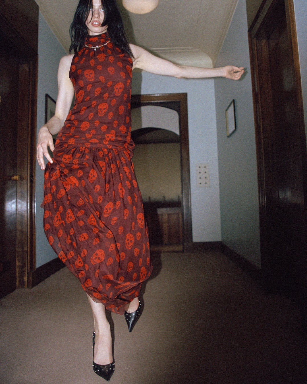 ジェッソ加工されたシルクジョーゼットラッフル、マックイーン スカルプリントのシルクツイル フォーラル、アイボリーのスパイダーウェブフローラルプリントシルクシフォン、スカル刺繍を施したオックスブラッドとファイアレッドのマックイーン スカルプリントシルクシフォンホルタートップ。
