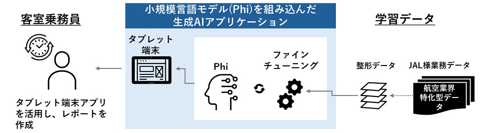 本実証では、客室乗務員がタブレット端末上でチャット形式で入力した情報に基づき、引き継ぎレポートを自動で生成し、レポート作成にかかる時間を大幅に削減することを確認しました。富士通は、AIサービスである「Fujitsu Kozuchi」を通じて社内外の実践の中で培った業務に特化した生成AIモデルの開発ノウハウを生かして、JAL様の過去のレポートを元に、「Phi」を客室乗務員の業務に特化したモデルへファインチューニング(注4)しました。