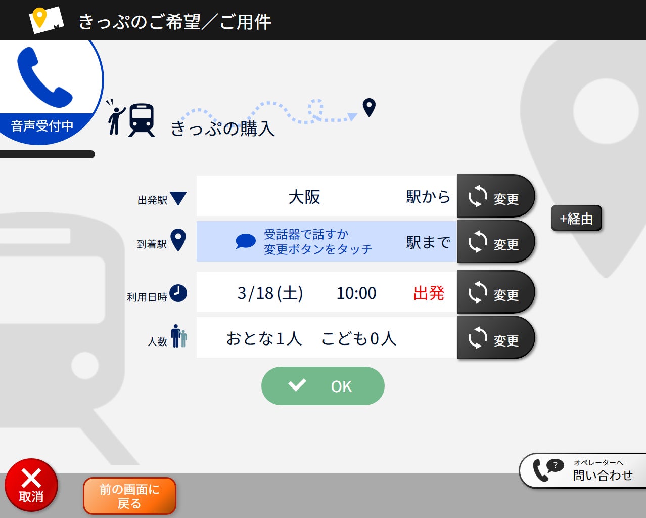 従来の「みどりの券売機プラス」に、AIによる自動応対機能を搭載いたします。画面に投影されるキャラクターとの対話を通じ、音声による操作できっぷの購入が可能です。