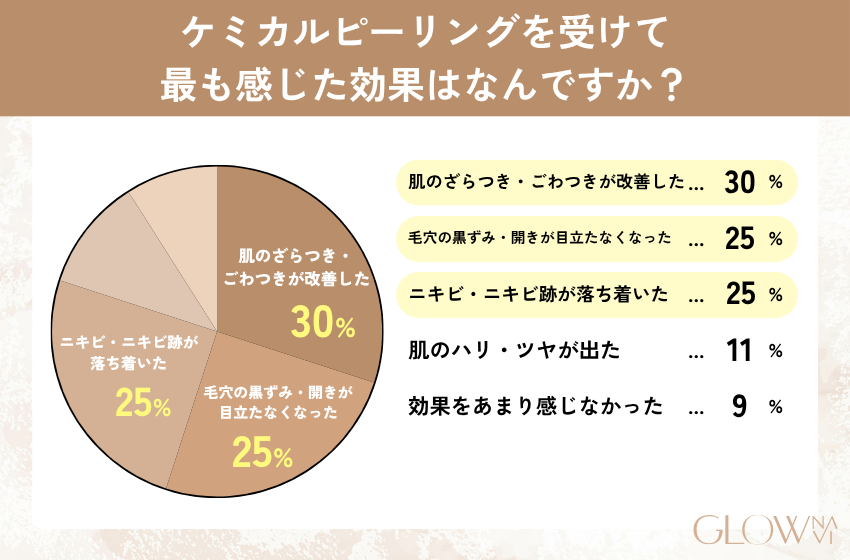ケミカルピーリングを受けて、「肌のざらつきやごわつきが改善した」「毛穴の黒ずみや開きが目立たなくなった」「ニキビやニキビ跡が落ち着いた」といった回答がそれぞれ多く寄せられました。個々の肌悩みに応じた効果が実感できていることがうかがえます。