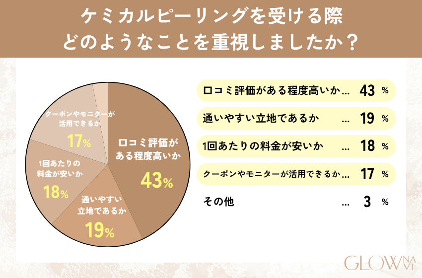 クリニック選びで「口コミ評価の高さ」を重視する人は約半数程度にのぼることが分かりました。また、ケミカルピーリングは複数回の施術が効果的であるため、通いやすさを重視する意見も多く見られました。