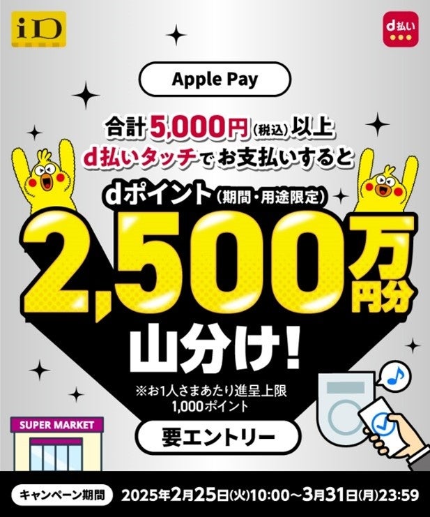キャンペーンサイトからエントリーの上、期間中にd払いタッチのApple PayまたはGoogle Payで合計5,000円(税込)以上のお買物をすると、2,500万円分のdポイント(期間・用途限定)を山分けにて進呈いたします。Apple Payと Google Pay それぞれのキャンペーンにて、2,500万円分ずつdポイント(期間・用途限定)を山分けします。進呈上限は、お1人さまあたり1,000ポイントで、「iD」加盟店でのご利用が対象です※5。 |