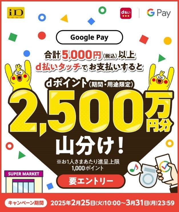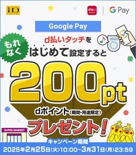 株式会社NTTドコモ(以下、ドコモ)は、「d払いタッチをはじめて設定で200ポイント進呈キャンペーン」および「d払いタッチご利用で2,500万ポイント山分けキャンペーン」を2025年2月25日(火)から2025年3月31日(月)まで開催いたします。