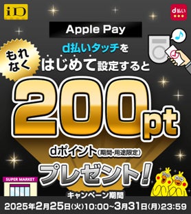 期間中に、「d払い®」アプリにApple PayまたはGoogle Pay※2をはじめて設定したお客さまに、もれなくdポイント(期間・用途限定)を200ポイント進呈いたします。エントリーは不要です。 なお、以前にd払いタッチを設定したことがあるお客さまが再設定した場合は、対象外です。 |