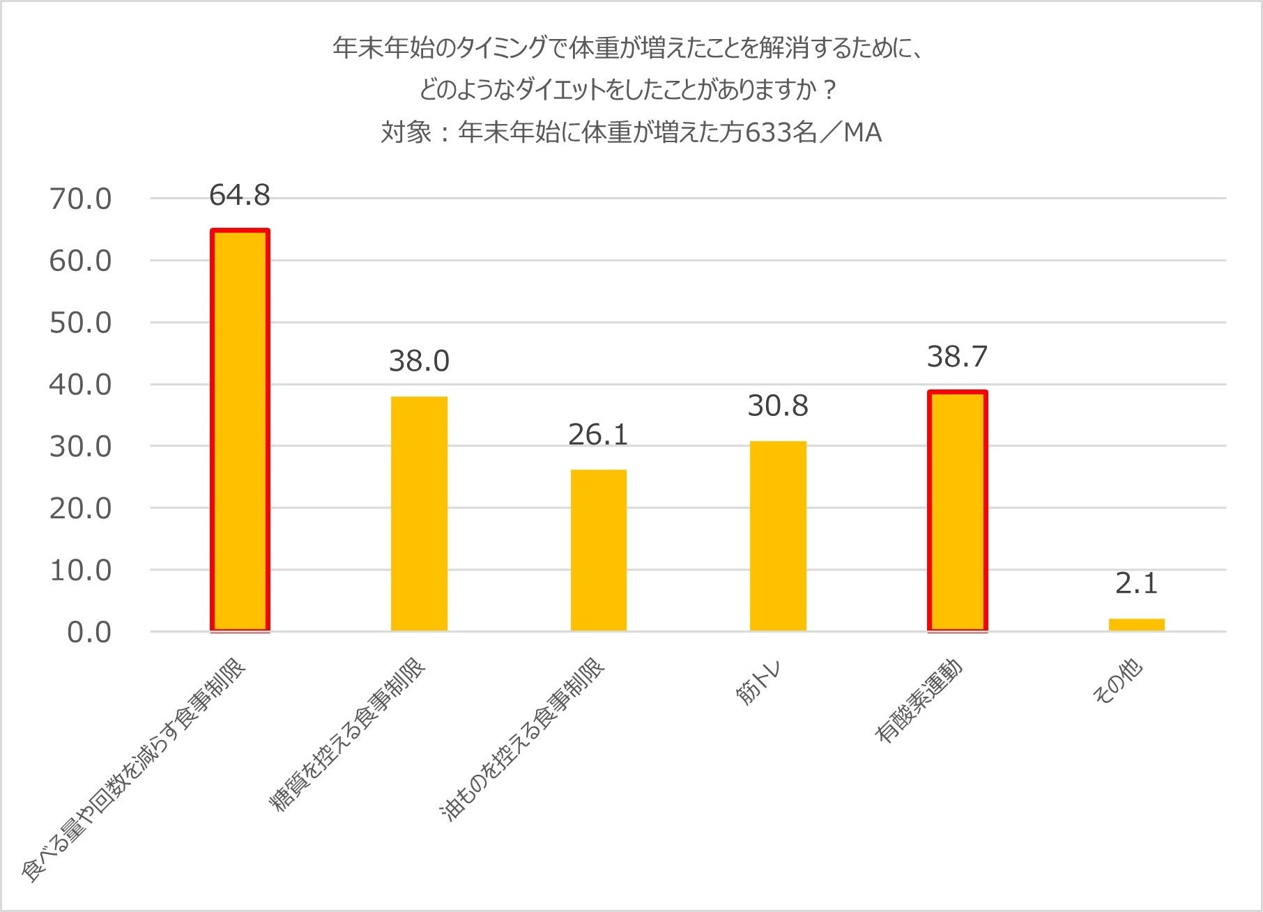 - お正月太り解消のためにダイエットをした経験がある方は64.7%。ダイエット方法1位は「食べる量や回数を減らす食事制限(64.8%)」、2位は「有酸素運動(38.7%)」
