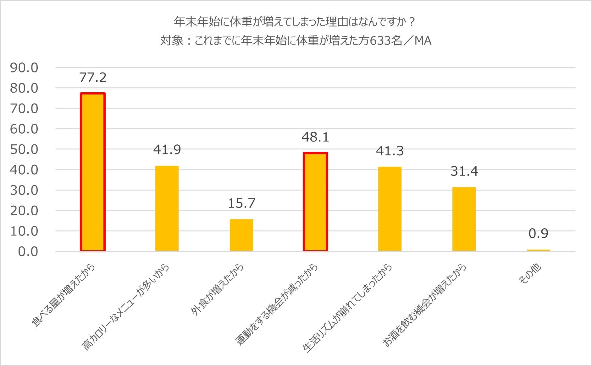 - 年末年始に体重が増えてしまう理由、1位は「食べる量が増えたから(77.2%)」、2位は「運動をする機会が減ったから(48.1%)