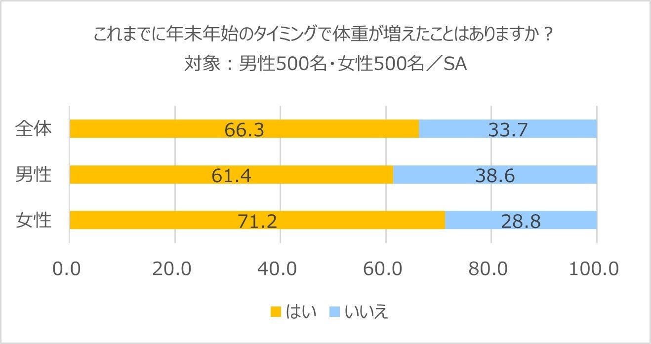 ■これまでに年末年始(12月末~1月3日までの間)のタイミングで体重が増えたことがある方は、66.3%。