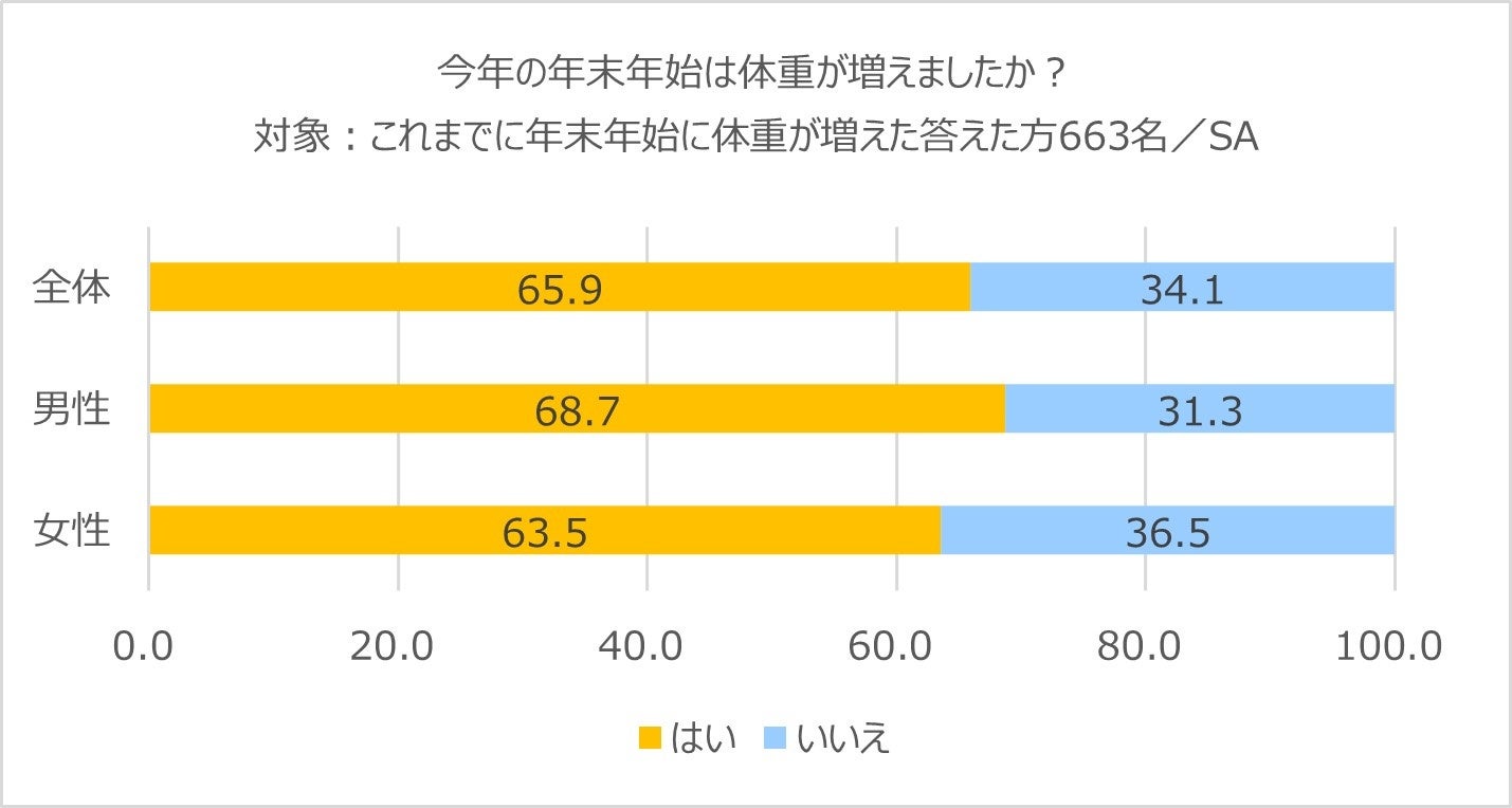 - これまでに年末年始(12月末~1月3日までの間)のタイミングで体重が増えたことがある方は、66.3%。今年の年末年始(2021年12月末~2022年1月3日までの間)のタイミングで体重が増えた方は、65.9%とほぼ横ばい