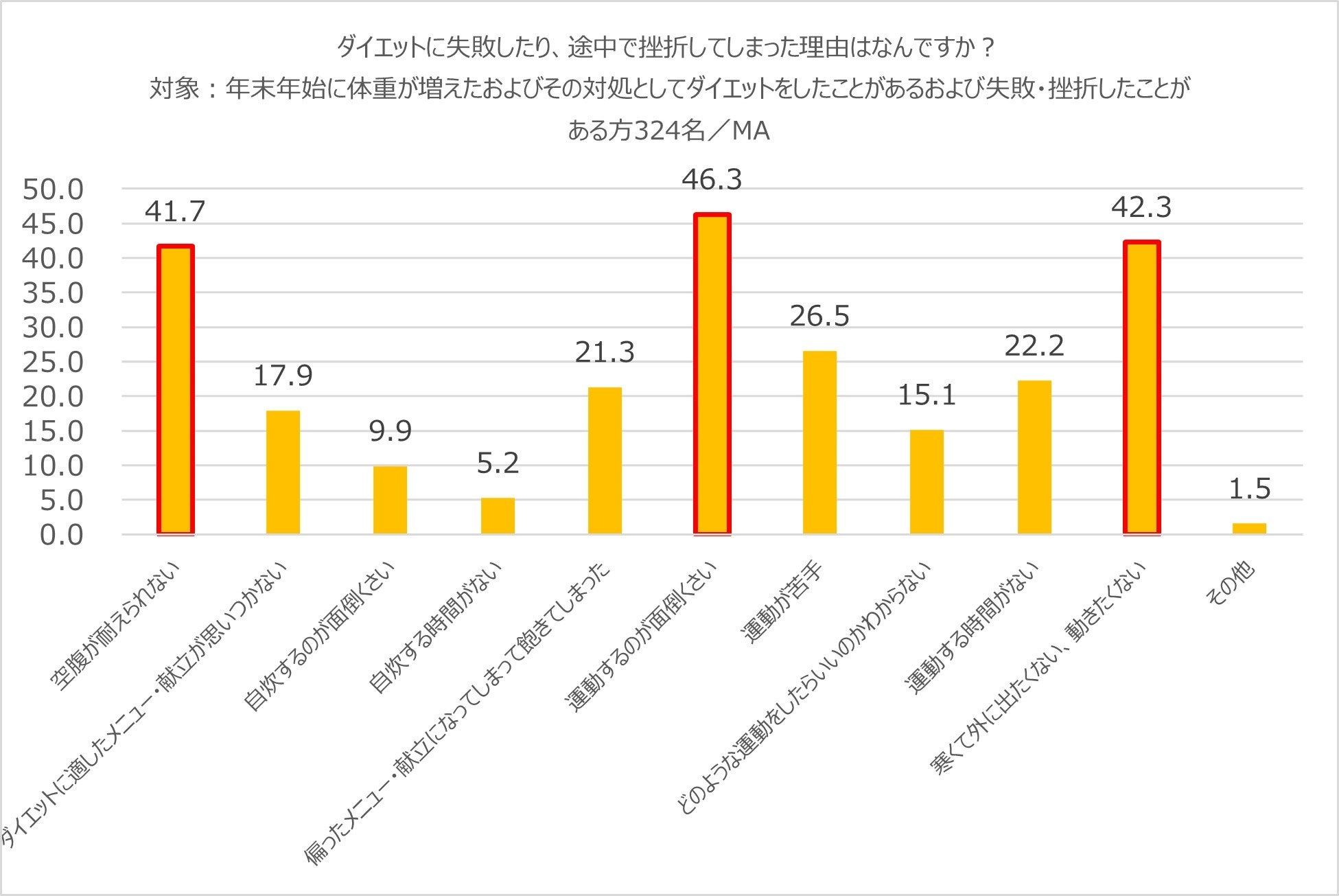 - 正月太り解消のためのダイエットで失敗や挫折した方は75.5%。理由は「運動するのが面倒くさい(46.3%)」、「寒くて外に出たくない、動きたくない(42.3%)」、「空腹が耐えられない(41.7%)」がTOP