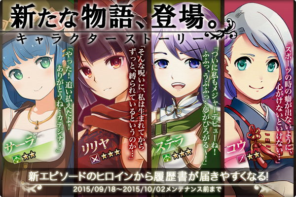 9月18日(金)のアップデートで「リリヤ」、「ステラ」、「サーラ」、「コウ」、4人のキャラクターストーリーが登場します。