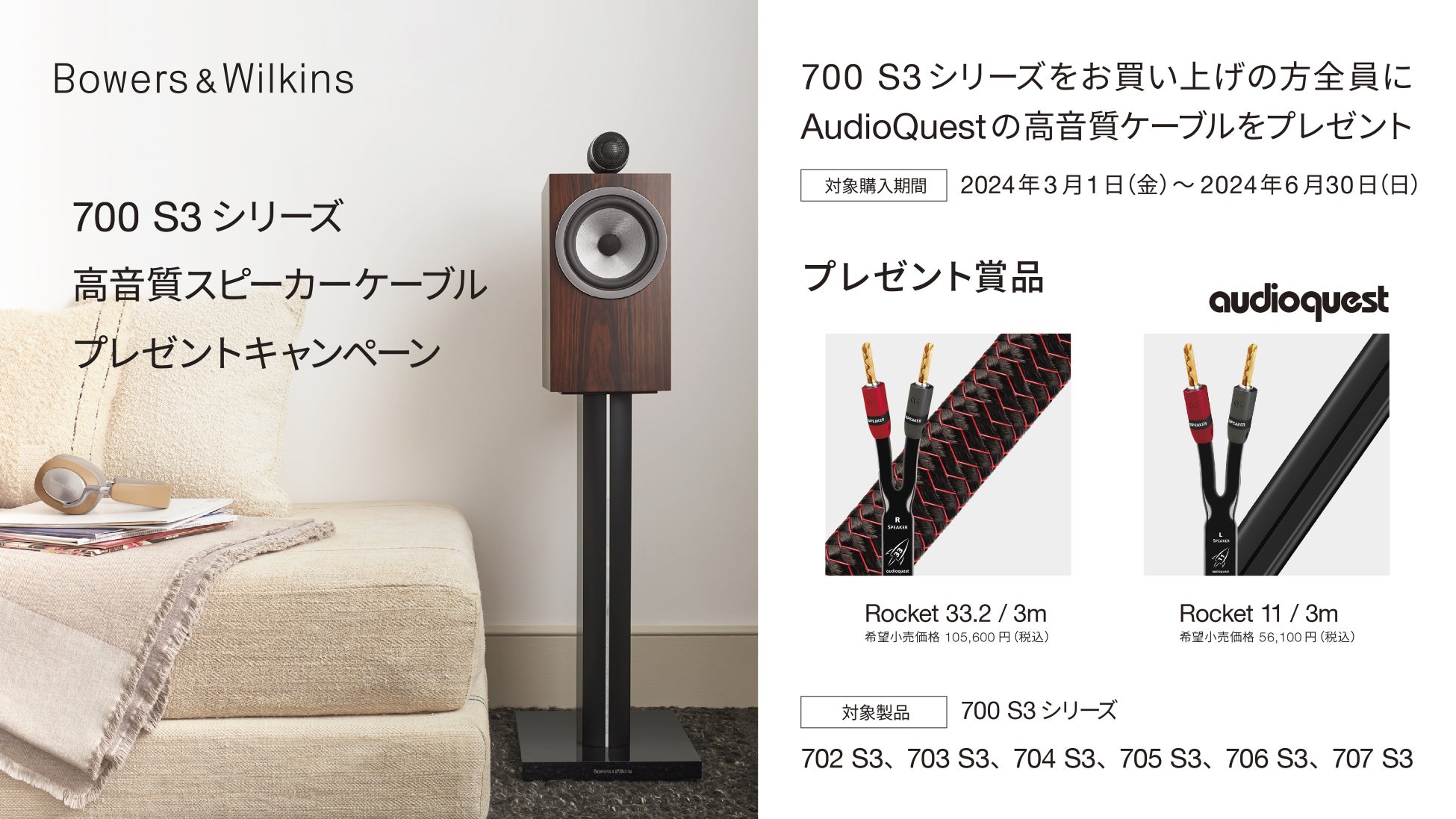 対象購入期間中に700 S3シリーズのステレオスピーカー(1組)をご購入の上、ご応募いただいた方全員に、700 S3シリーズにベストマッチなAudioQuestの高音質スピーカーケーブル「Rocketシリーズ」の「Rocket 33.2」または「Rocket 11」(3m / ペア / シングルバイワイヤ / 金メッキバナナプラグ仕様)をプレゼントいたします。