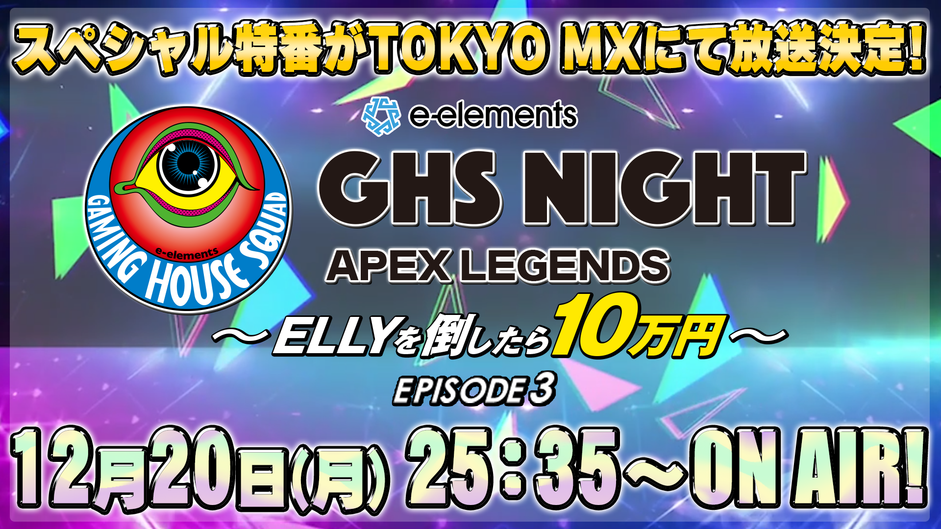 今回、11月18日(木)17:00から開催された、3回目となる番組公式イベント『GHS NIGHT EPISODE3 ~ELLYを倒したら10万円~』の模様を振り返るスペシャル特番『e-elements GHS NIGHT APEX LEGENDS EP3』を、TOKYO MXにて12月20日(月)25:35から放送します。