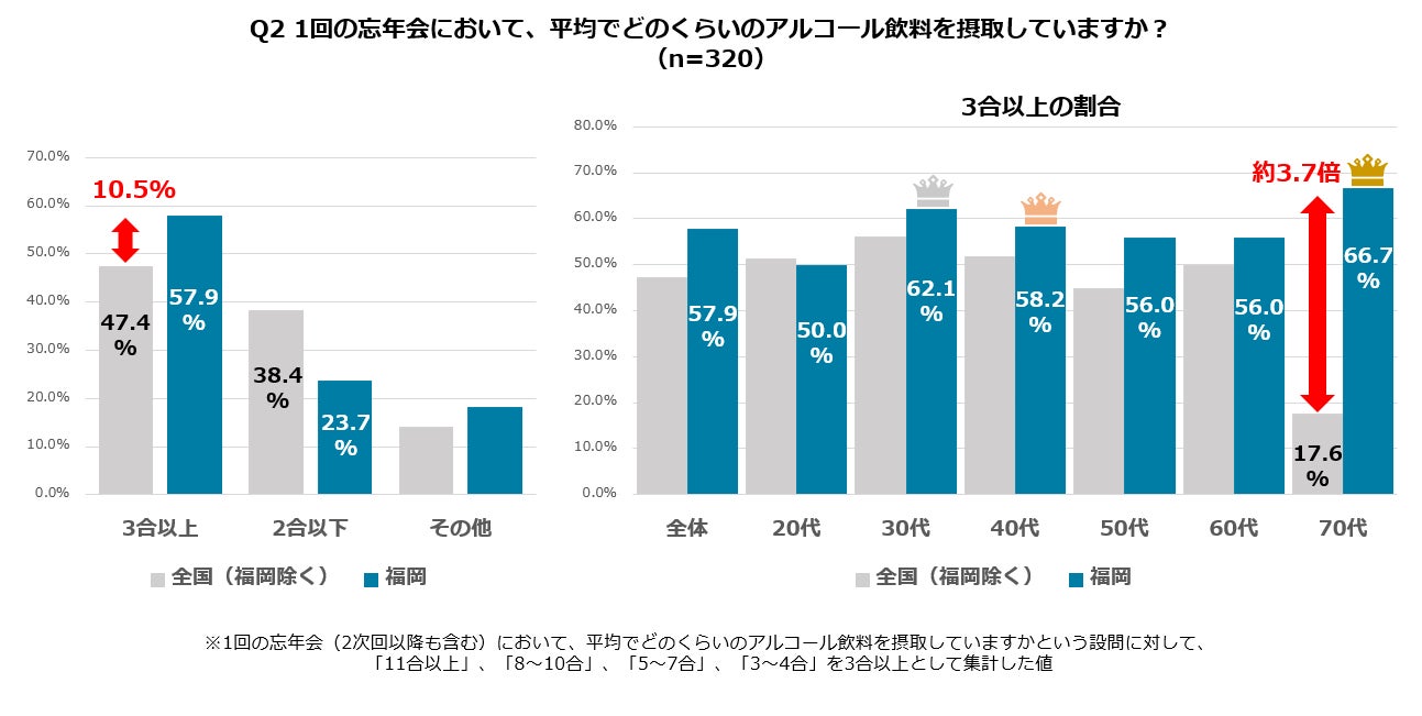 ● 1回の忘年会での飲酒量、3合以上が福岡57.9%(全国比+10.5%)