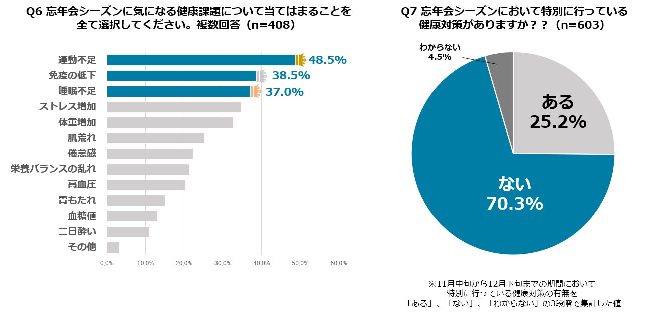 忘年会シーズンに気になる健康課題として最も多かったのは「運動不足」で48.5%。次いで「免疫の低下」の38.5%、「睡眠不足」37.0%と続き、年末特有の生活リズムの乱れに起因する課題が上位を占める結果となりました。これらの課題に対して意識的な対策を実施している人は25.2%にとどまり、約7割が具体的な対策を講じていない実態が明らかになりました。