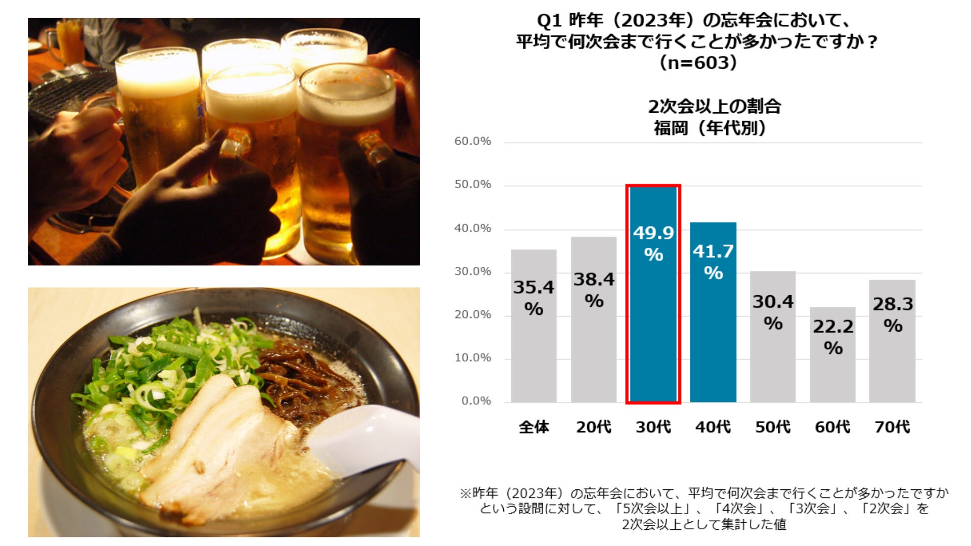 【忘年会に関する実態調査】"飲みどころ福岡"の実態が明らかに30代の49.9%は「もう一軒!」、〆のラーメンは6割超が支持