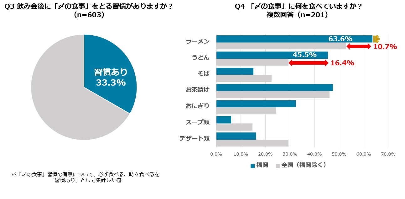 飲み会後の「〆の食事」習慣について全体の33.3%が習慣ありと回答しました。特に地域別での「〆の食事」内容に特徴が表れ、中でも福岡では、〆としてラーメンを選ぶ割合が63.6%と圧倒的な支持を集め、全国を10.7%上回る結果となりました。また、うどんを選ぶ割合も45.5%と全国より16.1%高く、福岡ならではの食文化が飲み会の締めくくりにも影響を与えていることが示唆されます。