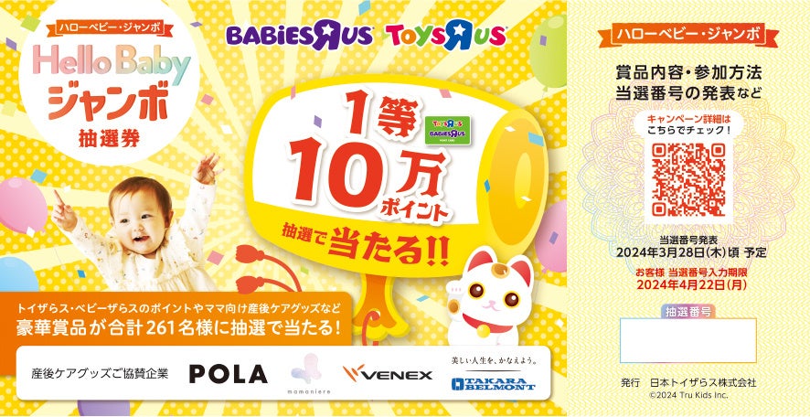 日本トイザらス株式会社(本社:神奈川県川崎市、代表取締役社長:李 孝)が運営するマタニティ・ベビー用品の総合専門店のベビーザらスは、2月23日の『ハローベビー・デー』に合わせて、『ベビーザらス・フェア』を2024年2月23日(金・祝)~3月18日(月)にかけて開催いたします。出産・子育てを応援するお得なセールや、豪華賞品が当たるキャンペーン、全国3会場 (東京都墨田区/岡山県倉敷市/和歌山県和歌山市) での体験型ベビーイベント「ハローベビー・フェスタ」の開催などを通して、これからベビーを迎えるプレママや子育て中のママ、パパ、ご家族の出産・子育てが、よりわくわく楽しいものとなるよう応援して参ります。